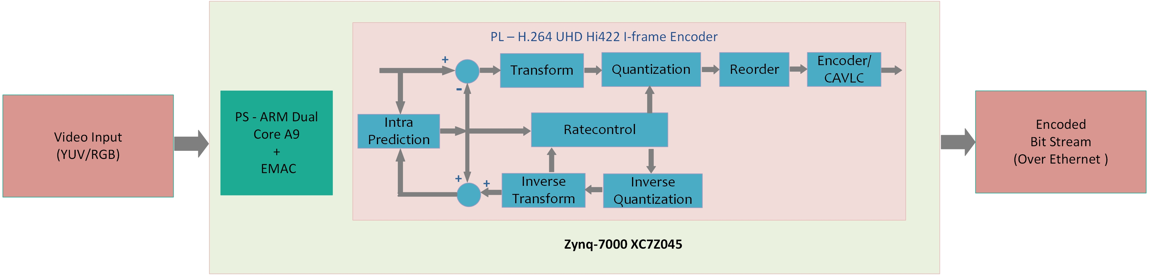 The encoder is implemented in a single Xilinx Zynq-7000 XC7Z045 all programmable SoC. The efficient implementation only takes up 63% of the programmable logic and DSP resources and 36% of the available RAM, leaving ample room for implementation of any other required circuitry. Integration of a Gb Ethernet MAC provides streaming over IP support.